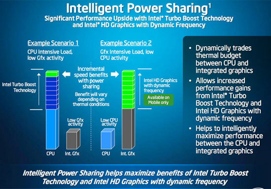 Beberapa fitur yang menarik dan baru adalah adanya Turbo boost, dimana sebuah prosesor dapat secara menaikkan kecepannya tau meng-overclock secara otomatis tergantung dengan keperluan dari prosesing data yang sedang dilakukan pada sebuah notebook. Sebenarnya Turbo boost ini juga ditemukan pada prosesor i7 pada desktop. Tetapi yang benar-benar baru adalah Turbo graphics, dimana prosesor dengan pintarnya akan membagi TDP (thermal design power) antara prosesor dengan graphics. Secara garis besarnya adalah bila prosesor lebih banyak berkerja maka TDP graphics akan turun se minimal mungkin dan begitu juga sebaliknya. Dengan adanya ini diharapkan akan menghemat daya sehingga masa hidup sebuah notebook akan semakin lama