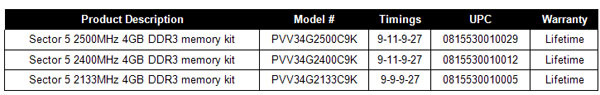 Patriot Viper II Series Sector 5 Edition module kits are geared as the ultimate upgrade for overclockers and enthusiasts looking to reach new heights in overclocking and benchmarking. Each module is individually hand tested and qualified in the Patriot lab at our headquarters in Fremont, CA. The Viper II Series Sector 5 Edition 2500MHz modules are specifically designed for Intel P55 platforms paired with Intel® Core™ i7 CPUs. Built with an extruded aircraft-grade aluminum heat spreader, Sector 5 2500MHz modules quickly dissipate heat from the memory ICs resulting in improved stability and reliability during extreme overclocking conditions. These modules will be offered as a 4GB kit (2 x 2GB modules) under the part number PVV34G2500C9K. In addition to the worlds fastest DDR3, Patriot is releasing two new module kits at 2400MHz and 2133MHz with timings of 9-11-9-27 and 9-9-9-27 respectively. Part numbers are: PVV34G2400C9K and PVV34G2133C9K.