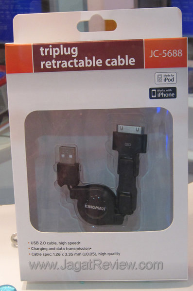 Kingmax triplug retracable cable merupakan kabel untuk device untuk iPod dan iPhone yang dapat digunakan untuk transfer data dan melakukan charging.