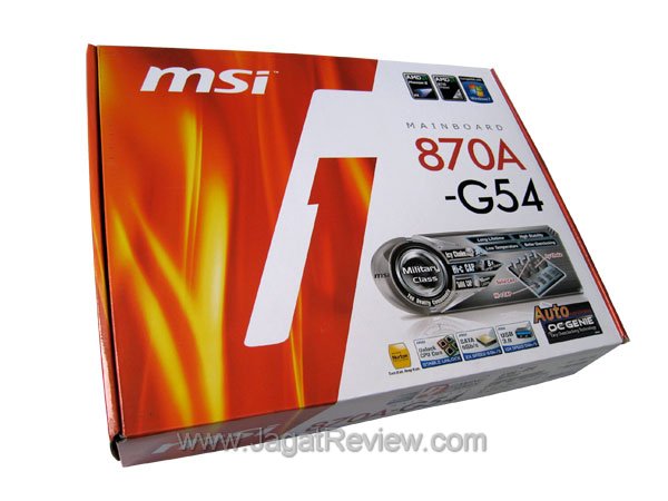 Sekarang, mari kita bahas motherboard-nya. MSI 870A-G54 memiliki faktor bentuk ATX standar. Kotak kemasannya dapat mudah dikenali karena memiliki corak pola khas motherboard MSI. Seperti beberapa produk-produk MSI sejenis yang dirilis belakangan ini, 870A-G54 dibuat dengan menggunakan komponen-komponen “military class”. Selain menambah daya tahan motherboard (misalnya, dalam melakukan overclocking), komponen kelas militer diklaim memiliki masa pakai yang lebih lama pula.
