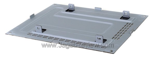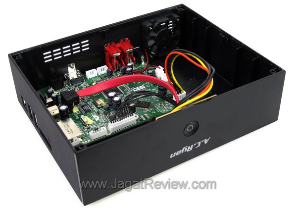 Lalu, buat apa delapan sekrup itu? Sisi bagian bawah pada sampel yang kami terima datang dalam keadaan tidak terkunci dengan sekrup. Bagian bawah A.C. Ryan PlayOn! HD Essential dapat langsung Anda buka sehingga memperlihatkan “jeroan” perangkat ini, seperti pada gambar di atas. Empat dari delapan sekrup tersebut digunakan untuk mengunci sisi bawah setelah Anda memasang hard disk.