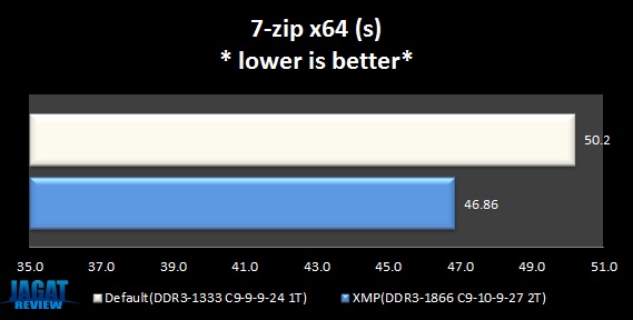 7-Zip 9.20 x64 adalah aplikasi yang biasa digunakan untuk melakukan kompresi file. Pada pengujian kali ini, kami melakukan kompresi file campuran (Gambar JPG, MP3, video HD, dan lain sebagainya) sebesar 766MB, dan mencatat seberapa cepat sistem kami dalam melakukan kompresi tersebut