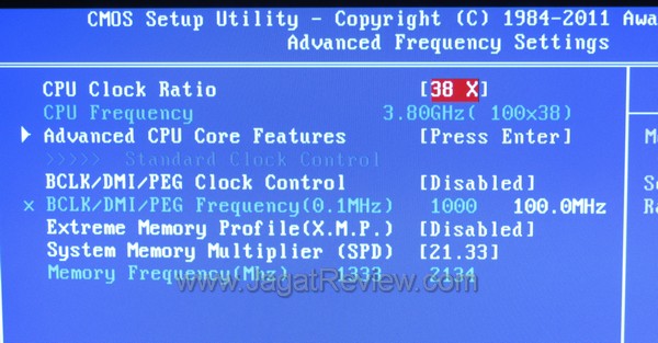 Namun, karena memori yang kami dapat kali ini merupakan RAM yang di-rating di DDR3-2133Mhz, tentunya “overclocking” secara definitif tidak dapat kami lakukan di sini karena frekuensi RAM sebesar 2133 Mhz adalah titik maksimal yang bisa dicapai seandainya Base Clock dijaga di nilai defaultnya (100 Mhz).