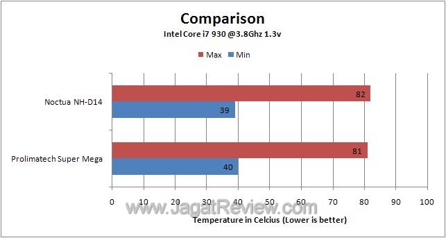 Kami sempat membandingkan secara singkat dengan Noctua NH-D14 dan kami mendapati bahwa suhu maksimal yang dicapai heatsink ini hanya terpaut kurang lebih 1-2 derajat saja baik dalam kondisi default maupun overclock. Dalam kondisi default, heatsink ini memiliki suhu maksimal yang sama yaitu 63 derajat celcius.
