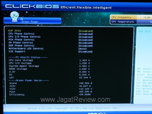 BIOS yang ada pada board ini kurang lebih mirip dengan BIOS yang ada pada board P67 MSI pada umumnya, hanya pilihan hardware monitoringnya sedikit lebih banyak dari MSI P67A-GD65 yang biasa kami gunakan.