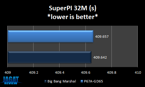 Seperti dugaan, board ini meng-handle CPU 5.6Ghz kami dengan mudah di benchmark single thread tersebut. Sayangnya kami tidak bisa menguji benchmark multi-thread seperti Wprime di 5.6Ghz karena keterbatasan CPU dan juga cooling. Overclocking di Sandy Bridge sendiri nampaknya sangat bergantung kepada CPU dan bukan di board, karena kami tidak melihat peningkatan berarti pada clockspeed CPU kami saat pindah dari MSI P67A-GD65 ke Big Bang Marshal. Walaupun bisa saja peningkatan baru terjadi di benchmark yang lebih menyiksa CPU saat menggunakan voltage lebih extreme lagi dengan extreme cooling tentunya, who knows?