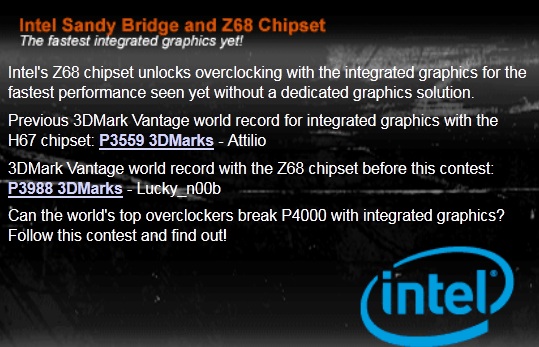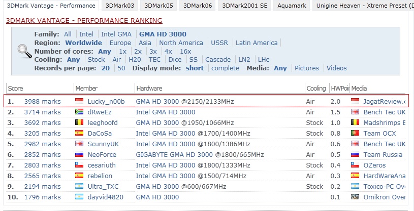 Sewaktu menerima informasi mengenai kompetisi ini, ada hal menarik yang kami jumpai. Pemegang 3DMarkVantage World Record untuk kategori Integrated Graphics saat artikel ini ditulis adalah rekan se-tim kami di JagatReview Overclocking Team: Alva ‘Lucky_n00b’ Jonathan, dengan skor P3988.