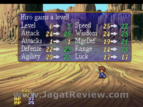 Walaupun salah satu elemen utama di dalam RPG adalah mencapai level karakter setinggi mungkin, namun tidak banyak yang mampu menawarkan keasikan ketika menjalani proses tersebut. Lunar Eternal Blue merupakan salah satu yang membuat saya betah untuk berlama-lama menatap layar televisi hanya untuk leveling up. Mengapa? Alasannya sederhana, karena hasil nyata yang diberikan di dalam game ini Melihat karakter yang memiliki damage lebih besar, skill yang lebih banyak, dan status yang lebih baik membuat semua ini terbayarkan. Perbedaan daya serang per levelnya cukup signifikan.