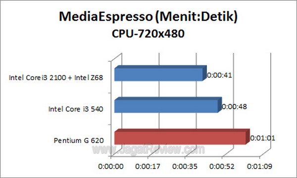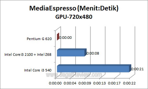 Pengujian pada MediaEspresso kembali memperlihatkan performa yang di bawah Core i3 2100 dan 540. Pengujian ini juga memperlihatkan salah satu kekurangan dari seri Pentium G yaitu tidak adanya feature Quick Sync sehingga MediaEspresso sama sekali tidak dapat menggunakan GPU untuk mengerjakan operasi transcoding.