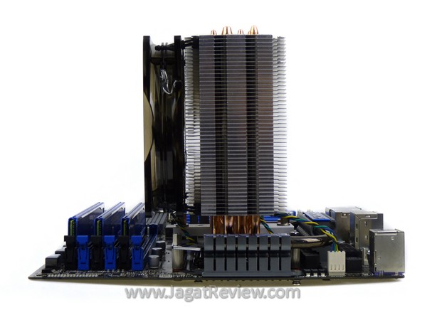 Xigmatek Aegir tampak ramping ketika terpasang di motherboard kami. Memory yang tinggi sekalipun dapat Anda gunakan untuk memenuhi semua slot memory yang ada. Bahkan, Anda dapat menambahkan sebuah fan tambahan tanpa membuat sekeliling motherboard menjadi terlalu sempit. Satu hal yang masih merepotkan adalah pemasangan karet silikon di kipas yang cukup menyusahkan, walau fungsinya sebagai peredam getaran kipas memang lebih baik dibanding model klip.