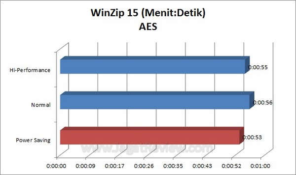 Sebuah folder berukuran 700 MB berisi ratusan file dari berbagai jenis dijadikan materi kompresi untuk pengujian. Di grafik di atas, Anda dapat melihat perbedaan kecepatan masing-masing prosesor saat mengerjakan kompresi tersebut. Kompresi kedua dengan tambahan enkripsi AES-256 bit untuk menambah beban juga dijalankan. Hasil pengujian disajikan dalam satuan waktu. Semakin sedikit waktu yang dibutuhkan, semakin baik.