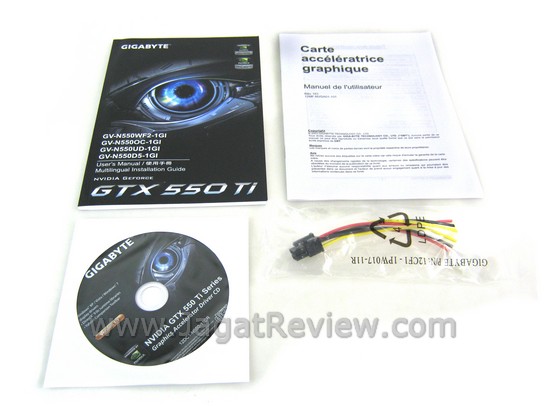Kemasan penjualan Gigabyte GTX 550 Ti ini hadir dengan tema warna hijau gelap, dengan desain model sebuah (lensa) mata robot yang terlihat futuristik dan canggih. Pada kemasannya ini, Gigabyte memberikan informasi mengenai beberapa feature yang dimiliki graphics card ini seperti Windforce Anti Turbulance Cooling. Windforce Anti Turbulance Cooling adalah metode pendinginan (HSF) yang digunakan dengan dua buah kipas ekstra besar. Selain itu juga Gigabyte menunjukkan bahwa produk ini sudah mendapatkan spesifikasi factory overclocked.