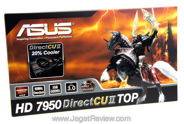 Kemasan berwarna oranye dengan gambar seorang ksatria berkuda menjadi ciri khas kemasan produk graphics card AMD produksi ASUS.