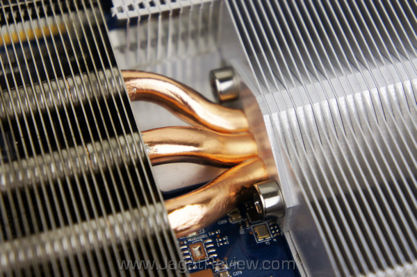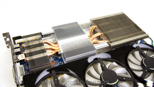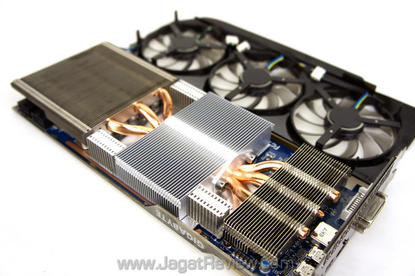 Saat kami melepas komponen kipas, terlihat heatsink pasif yang terbuat dari bahan alumunium. Terlihat tiga area pendinginan pada heatsink ini dimana setiap area ditangani oleh satu buah kipas. Tiga buah heatpipe tembaga berdiameter 8 mm berfungsi mengalirkan panas dari chip GPU menuju masing-masing area pendinginan.