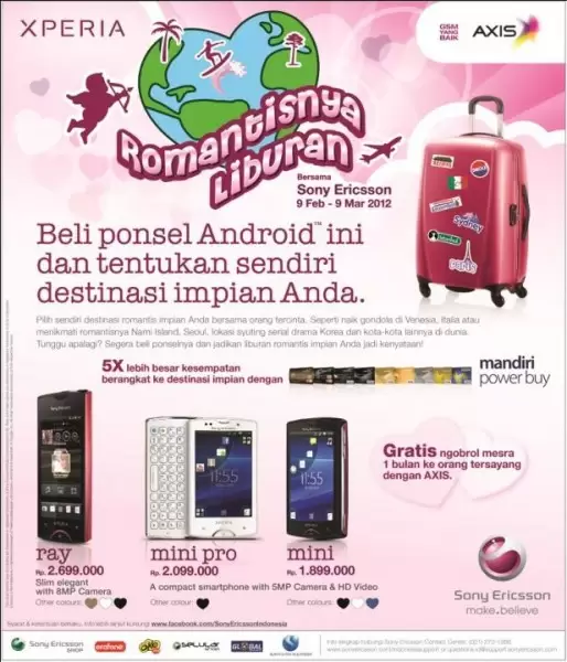 Promo Valentine Sony Ericsson didukung oleh Bank Mandiri yang menawarkan manfaat cicilan hingga 12 bulan dengan bunga 0% mandiri power buy. Setiap pembelian Sony Ericsson Xperia Ray (Rp2.699.000), Xperia Mini (Rp1.899.000), dan Xperia Mini Pro (Rp2.099.000) dengan kartu kredit Mandiri berkesempatan lima kali lebih besar untuk mendapatkan destinasi liburan romantis pilihan pembeli.