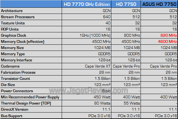 ASUS melengkapi produk Cape Verde Pro mereka dengan clock GPU sebesar 820 MHz (20 MHz lebih tinggi) dan 4600 MHz (100 MHz lebih tinggi) untuk clock memori. Dengan spesifikasi clock seperti ini, sejauh mana peningkatan kinerjanya dibandingkan HD 7750 reference?