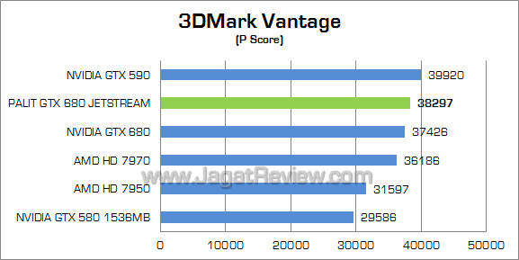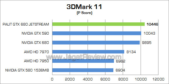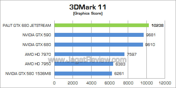 Palit GTX 680 JetStream menempati peringkat teratas di benchmark DirectX 11 ini dengan selisih performa sekitar 6% dengan GTX 680 reference.