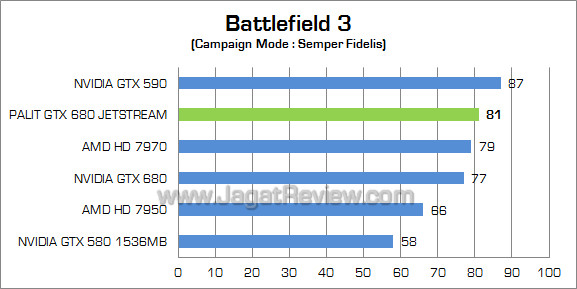 Di game FPS yang menggunakan engine Frosbite 2.0 ini, Palit GTX 680 JetStream unggul sekitar 5% dibandingkan GTX 680 reference.