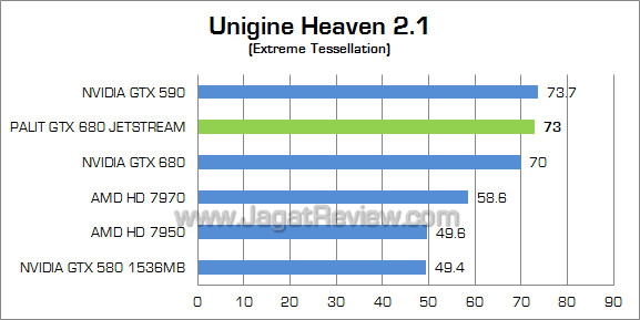 Benchmark dengan menu utama Tessellation ini menunjukkan keunggulan Palit GTX 680 JetStream sekitar 4% di atas GTX 680 reference.