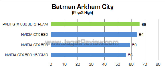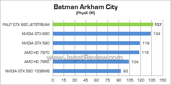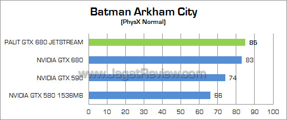 Game yang mampu memaksimalkan fitur PhysX milik NVIDIA ini menunjukkan keunggulan sekitar 3% di Palit GTX 680 JetStream atas GTX 680 reference. Tidak hanya itu, Palit GTX 680 JetStream juga mampu melampaui kinerja graphics card dual-GPU, GTX 590.