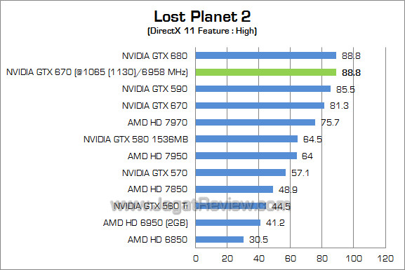 Overclock membuat performa GTX 670 meningkat sekitar 13% dan mampu mengungguli performa seluruh graphics card peserta pengujian.