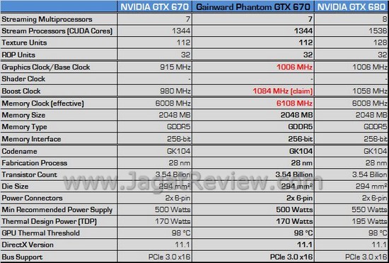 Seperti yang telah kami sebutkan di atas, Gainward GTX 670 Phantom ini sudah memiliki “dapur pacu” yang ditingkatkan secara default (pre-OC). Gainward menggunakan core clock yang sama dengan GTX 680 yaitu 1006 MHz dan dengan memory clock 6108 MHz (efektif) yang lebih tinggi 100 MHz dari spesifikasi defaultnya. Dengan peningkatan clock yang digunakan ini, tentu saja menjanjikan peningkatan performa yang cukup signifikan, selain itu Boost Clock yang diklaim juga tergolong tinggi (1084 MHz), yang kami ramalkan akan mendongkrak kinerja graphics card ini secara keseluruhan.