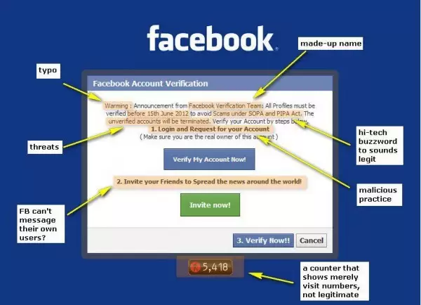 Ada beberapa keanehan yang terlihat dari “Facebook Account Verification” ini. Yang paling mudah ditemukan adalah adanya typo. Di awal kalimat, Anda akan menemukan kata “Warming”. Kata yang seharusnya dituliskan adalah “Warning”. Tim Facebook sangat jarang melakukan kesalahan seperti typo ini, sehingga sangat mungkin kalau ajakan ini tidak berasal dari Facebook. Pada beberapa kasus penipuan di Facebook lainnya juga sering sekali terlihat typo.