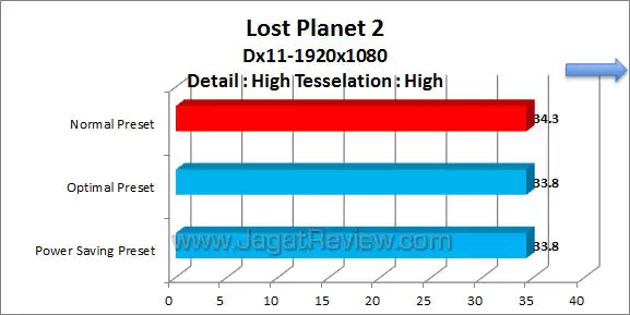 Lost Planet 2 adalah salah satu game 3rd person action yang cukup populer di pasaran. Maka dari itu kami menggunakan game ini sebagai salah satu barometer performa bagi pengujian hardware. Pengujian kami lakukan di mode DirectX 9.0 dan DirectX 11.0 menggunakan benchmark internal dari game ini sendiri.