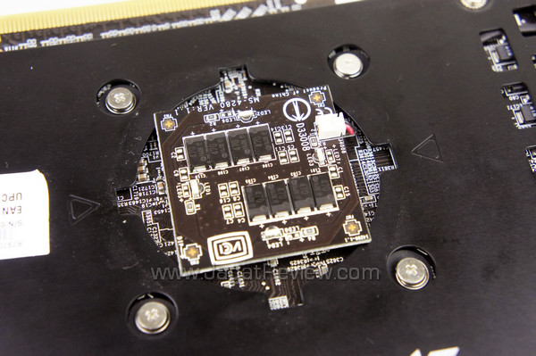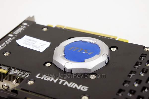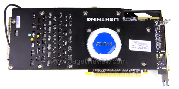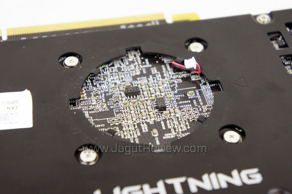 Sisi bawah PCB MSI HD 7970 Lightning dilengkapi pelat metal yang berfungsi mendinginkan komponen-komponen yang berada di sisi ini dan juga untuk mencegah PCB menjadi bengkok. Mungkin saat ini Anda bertanya-tanya benda apakah yang berwarna biru di tengah-tengah PCB?