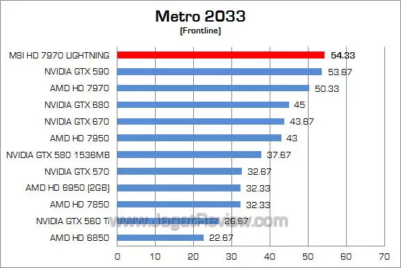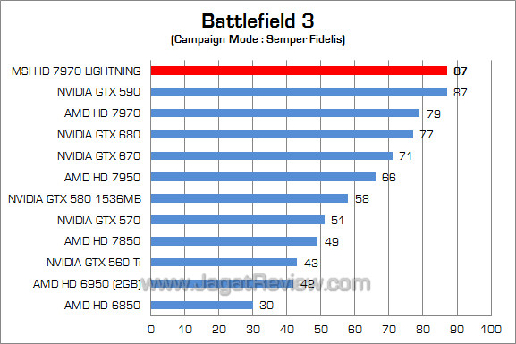 Berpindah ke benchmark game dengan engine Frostbite 2.0, MSI HD 7970 Lightning mampu menyamai performa GTX 590 yang merupakan graphics card dual-GPU.