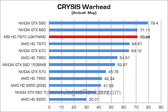 MSI HD 7970 Lightning unggul 9% di atas HD 7970 dan mampu bersaing ketat dengan performa GTX 680 pada game berbasis Cry Engine 2.0 ini.