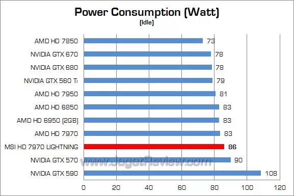 Dengan peningkatan performa hingga 11%, MSI HD 7970 Lightning mengonsumsi daya 10% lebih tinggi dibandingkan HD 7970 pada kondisi full load dan 3% lebih tinggi pada kondisi idle.
