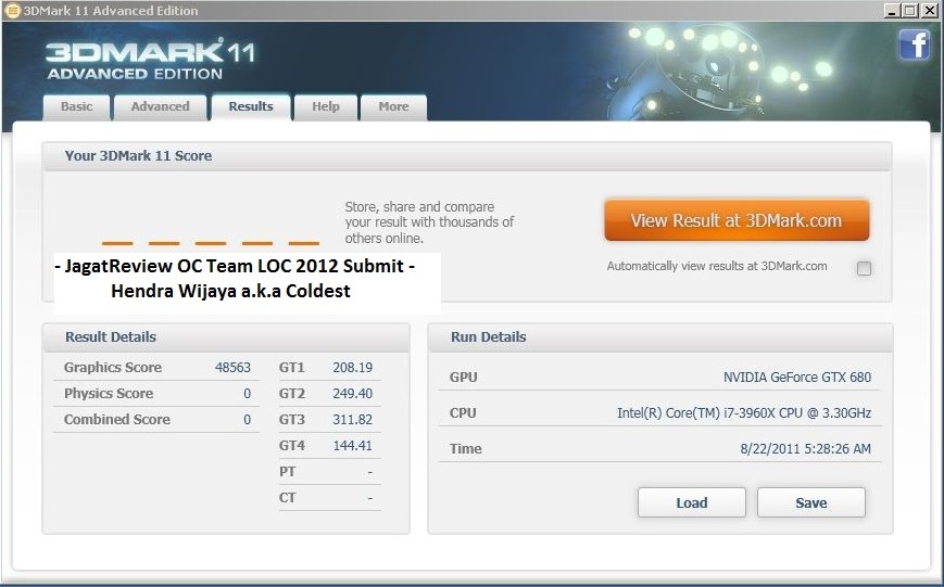 Dari 3(tiga) kategori yang dipertandingkan, rekan kami Hendra Wijaya a.k.a Coldest, memenangkan kategori 3DMark 11 Graphics Score Multi-GPU dengan Graphics Score 48563.