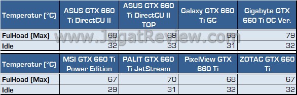 Metode pengujian : Pengukuran temperatur graphics card dilakukan dengan menggunakan aplikasi GPU-Z. Pengukuran temperatur pada kondisi full-load dilakukan dengan mencatat temperatur tertinggi yang didapatkan saat menjalankan aplikasi Unigine Heaven 2.1 yang “looping” sebanyak tiga kali. Sedangkan untuk kondisi idle, kami mencatat temperatur terendah setelah kami biarkan sistem tidak melakukan aktivitas apapun selama 15 menit dengan kondisi layar menampilkan desktop Windows. Pengukuran dilakukan di dalam casing tertutup dengan suhu ruangan 26-27 °C.