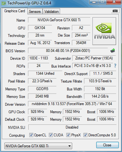Berukuran mungil tidak menjadikan graphics card Zotac GTX 660 Ti ini minim dari segi performa, graphics card ini datang dengan spesifikasi Pre-OC menggunakan base clock 928 MHz dan clock maksimum hingga 1097 MHz, walaupun tidak terlalu tinggi, namun clock yang digunakan ini cukup untuk melibas peserta lain yang masih menggunakan spesifikasi standar GTX 660 Ti reference.