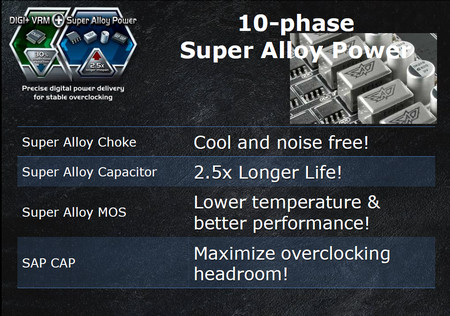 ASUS melengkapi graphics card ini dengan feature Digi+ VRM yang dikombinasikan dengan 10-phase Super Alloy Power untuk menjamin kestabilan graphics card saat melakukan overcloking.