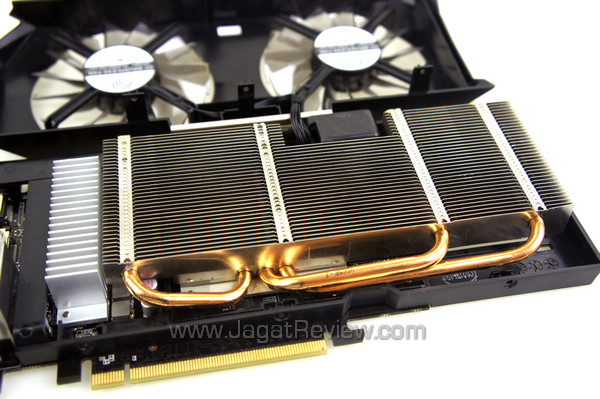 Komponen heatsink JetStream dilengkapi tiga buah heatpipe tembaga yang mengalirkan panas dari chip GPU menuju sirip-sirip alumunium.
