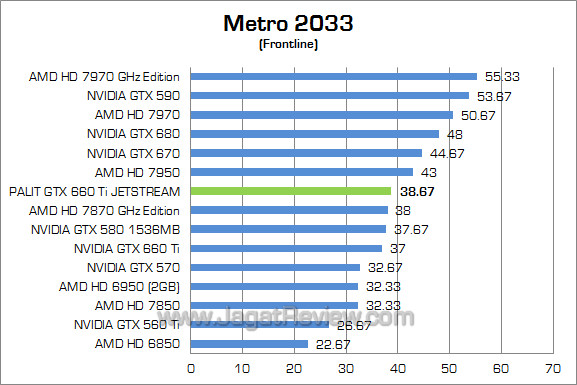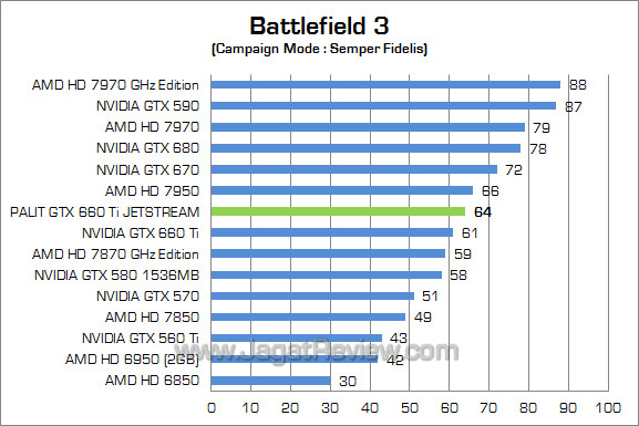 Pada engine Frostbite 2.0, Palit GTX 660 Ti JetStream memiliki performa mendekati 5% lebih tinggi di atas versi reference.