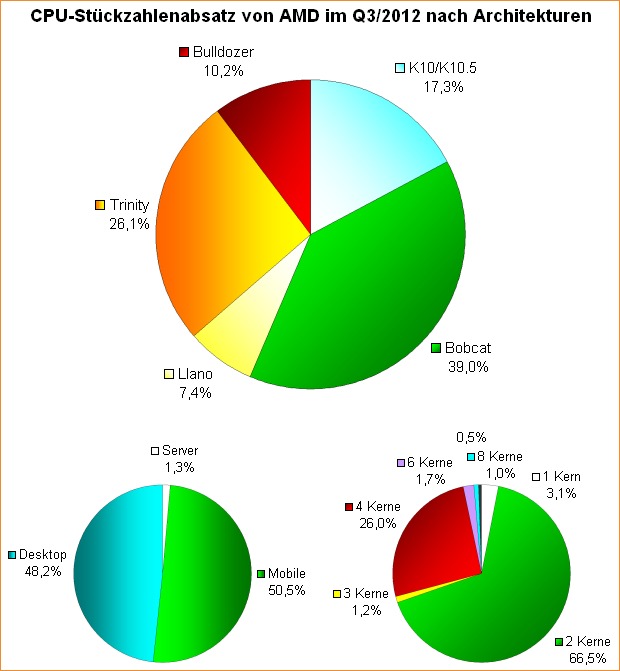 Chip dengan kode nama “Bobcat” atau disebut juga dengan nama Zacate yang ditujukan untuk platform APU kelas entry-level hemat energi ini mendominasi penjualan AMD sebesar 39 persen, dengan produk berbentuk netbook, nettop, dan desktop all-in-one. Menyusul APU Trinity A-Series dengan penjualan sebesar 26,1 persen yang memang baru saja diperkenalkan beberapa waktu lalu, dan tersedua dalam bentuk produk desktop dan juga varian mobile notebook. Dan terakhir AMD A-Series Llano sebagai generasi awal dari APU AMD dengan penjualan paling rendah hanya mendapatkan porsi 7,4 persen saja dari total penjualan.