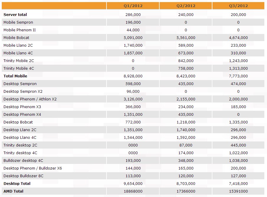 Berikut juga disertakan tabel penjualan prosesor AMD selama periode tiga kuartal terakhir dalam bentuk jumlah unit yang terjual.