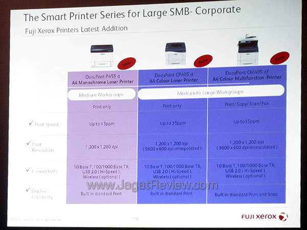 Untuk semakin mengokohkan posisinya, di tahun 2013 ini Fuji Xerox sudah mempersiapkan 3 “mainan” terbaru mereka untuk pasar printer laser Indonesia. Printer laser terbaru tersebut adalah DocuPrint P455 d, DocuPrint CP405d, dan DocuPrint CM405 df. Printer laser tersebut datang dengan berbagai teknologi untuk menghemat biaya cetak. Beberapa di antaranya seperti kemampuan mencetak duplex (bolak-balik), komponen drum dengan daya tahan lebih lama, dan juga EA Eco Toner yang mampu menghemat konsumsi daya hingga 25%. Tidak hanya itu, printer laser dari Fuji Xerox juga datang dengan aplikasi manajemen penggunaan printer bernama Auditron. Aplikasi ini akan memanajemen penggunaan printer jaringan secara perorangan seperti siapa yang hanya dapat mencetak hitam putih atau siapa saja yang dapat mencetak foto.