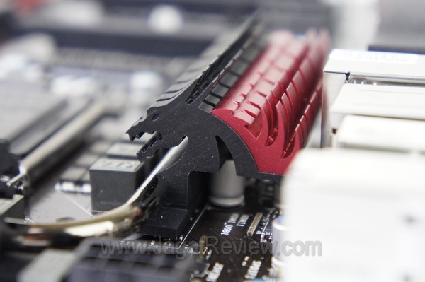 Perbedaan mencolok pertama: desain heatsink untuk PCH, disertai simbol naga dan color scheme hitam-merah