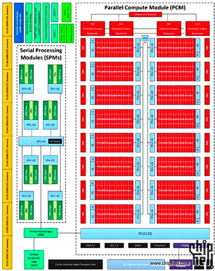 Terlihat blok diagram chip GPU Hawaii sangat berbeda sekali dengan chip GPU Tahiti XT. Tampaknya AMD membangun chip GPU ini dari awal, tidak lagi berbasiskan arsitektur generasi sebelumnya. Pada chip GPU tersebut, Parallel Compute Module (PCM) sepertinya akan digunakan untuk pengolahan grafis dan Serial Processing Modul (SPM) akan melakukan komputasi di luar grafis. Ada dugaan unit SPM akan berbasiskan arsitektur x86 atau ARM.