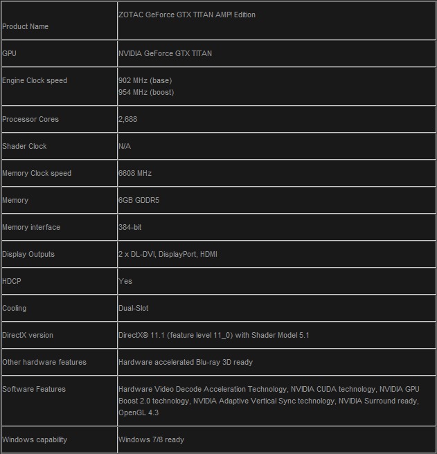 Meskipun kartu grafis NVIDIA GTX TITAN adalah VGA Single-GPU tercepat di dunia saat ini, namun ada saja para pengguna yang masih mengharapkan performa lebih lagi. Untuk memenuhi kebutuhan pengguna-pengguna ini, ZOTAC meluncurkan kartu grafis ZOTAC GeForce GTX TITAN AMP! Edition. ZOTAC men-setting kecepatan GPU dan juga memori dari GTX TITAN sekitar 10% diatas kecepatan standarnya, dengan GPU Clock berada pada 902Mhz(base) / 954(boost), dan kecepatan memori GDDR5 6608Mhz. Diharapkan dengan konfigurasi factory-overclocked ini, para pengguna bisa menikmati vga GTX TITAN mereka dengan lebih maksimal. Berikut ini spesifikasi lengkap dari ZOTAC GeForce GTX TITAN AMP! Edition: