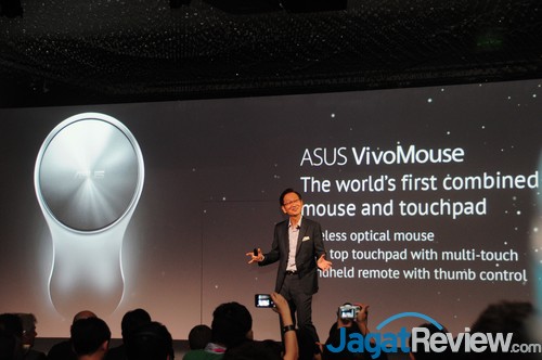 Ini adalah perangkat pengendali yang teramat unik. ASUS VivoMouse adalah sebuah wireless optical mouse dengan fitur touch-pad multi-touch. Saat diangkat, ASUS VivoMouse ini menjadi remote control yang dilengkapi thumb control. Singkat kata, ASUS VivoMouse adalah kombinasi mouse dengan touchpad pertama di dunia yang dirancang untuk pengendalian WIndows8.