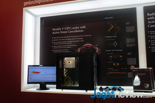 Primadona dari booth Noctua tahun ini adalah sebuah pendingin prosesor yang memiliki active noise canceling. Bekerja sama dengan sebuah perusahaan baru bernama Rotosub, Noctua mengembangkan sebuah heatsink yang memiliki tingkat keheningan yang cukup tinggi.