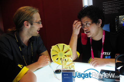 Salah satu “daya tarik” mengunjungi booth Noctua adalah pejabat PR dan Press mereka yang bernama Mag. Jakob Dellinger. Cara menerangkan yang antusias dan riang pasti akan membuat siapa pun akan seakan “tersihir” untuk tetap mendengarkan penjelasan pria yang akrab disapa Jakob ini. Terlihat pada foto diatas bagaimana serunya diskusi Jakob dengan rekan kami Alva Jonathan dan bagi Anda yang pernah bertemu dengan Alva, tentunya tahu betapa antusiasnya rekan kami yang satu ini ketika bertemu dengan lawan bicara yang sepadan.