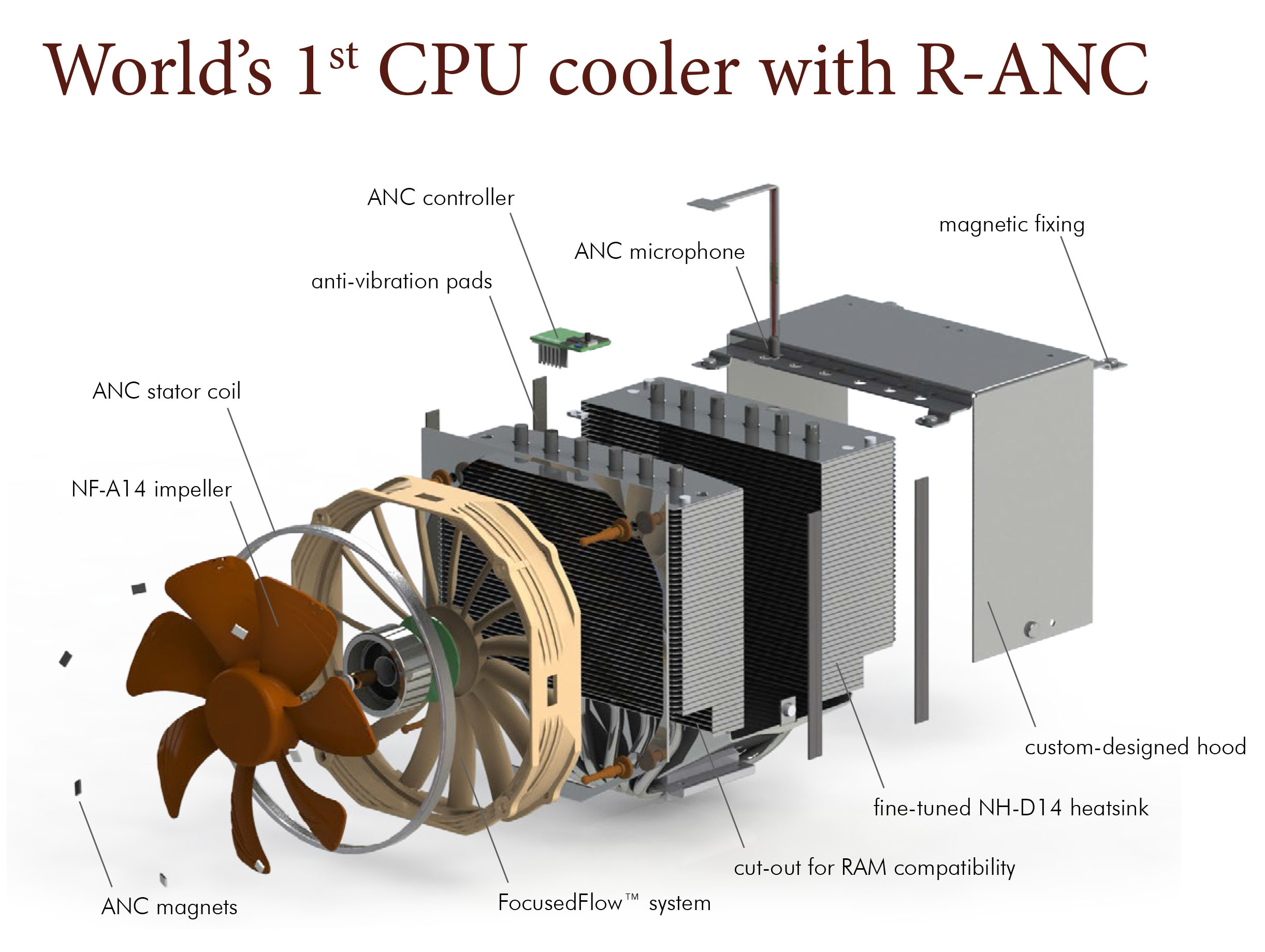 Dengan menggunakan basis kombinasi cooler tersukses mereka yaitu NH-D14 dan fan NF-A14, Noctua mengintegrasikan teknologi R-ANC (RotoSub Active Noise Cancellation) kedalam heatsink terbaru ini. Teknologi R-ANC ini menggunakan bilah-bilah dari fan untuk menghasilkan gelombang suara yang akan meniadakan kebisingan yang dihasilkan oleh fan itu sendiri.