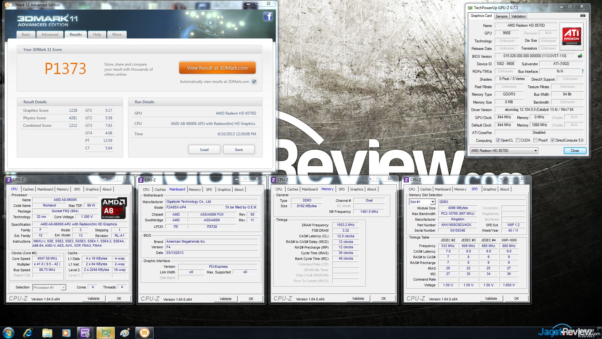 Pada setting memory 1333MHz hasil benchmark menunjukkan hasil standard performa A8-6600k ini, tetapi ketika terjadi peningkatan +/- 533MHz (1866MHz) terjadi kenaikan score benchmark yang signifikan yaitu: