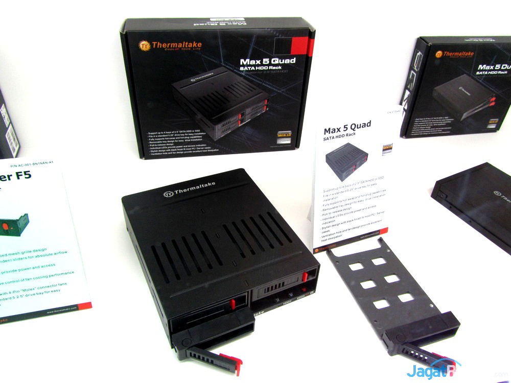 Selain LED Strip tersebut, Thermaltake juga menampilkan produk lain, yaitu keluarga HDD Rack Max 5. HDD Rack tersebut mampu mengakomodasi penggunaan beberapa storage dengan ukuran 2.5″ ke dalam bay 3.5″ atau 5.25″ di casing. Terdapat dua seri HDD Rack Max 5 tersebut, yaitu Max 5 Duet dan Max 5 Quad, yang sesuai dengan namanya masing-masing mampu menampung 2 dan 4 storage 2.5″.